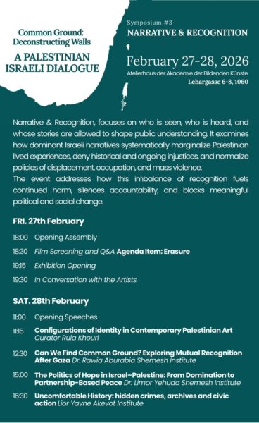 Diese Symposiumsreihe “Common Ground – Deconstructing Walls” soll eine künstlerische und aktivistische Intervention sein, die den Dialog und das Verständnis innerhalb der mannigfaltigen und manchmal gespaltenen Wiener Gesellschaft und darüber hinaus in Bezug auf Palästina und Israel fördert. Dies findet vor dem Hintergrund sich vertiefender Spaltungen, Entmenschlichung und Gewalt, angefangen bei der ethnischen Säuberung im Jahr 1947 über die Jahre der Besatzung bis hin zu gegenseitiger Gewalt, die in dem Massaker der Hamas am 7. Oktober und dem Völkermord in Gaza gipfelte, statt.