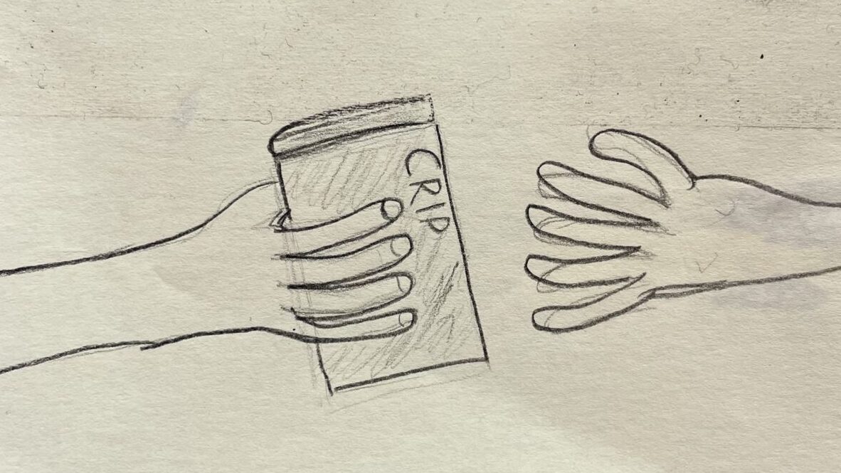 Bildbeschreibung: Eine Zeichnung aus Bleistift und schwarzem Stift. Zwei Hände, die zueinander ein Buch oder Magazin reichen, auf dessen Cover das Wort CRIP lesbar ist. Bildnachweis: unbekannten Künstler*in / 1. OFFENEN redAKTION 2025