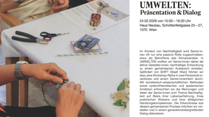 UMWELTEN ist eine Workshop-Reihe zu Nachhaltigkeit in Senior*innenheimen. Gemeinsam mit Senior*innen widmet sich das interdisziplinäre Projektteam diesem komplexen Thema mittels systemischen Denkens und künstlerischer, spielerischer methodischer Ansätze. Wir verstehen die Senior*innen dabei als aktive Mitgestaltende unserer Gesellschaft mit relevantem Erfahrungswissen zu Nachhaltigkeit. Dieses wird mit Expertise aus den wissenschaftlichen und künstlerischen Nachhaltigkeitsdiskursen in Austausch gebracht und in diese integriert.